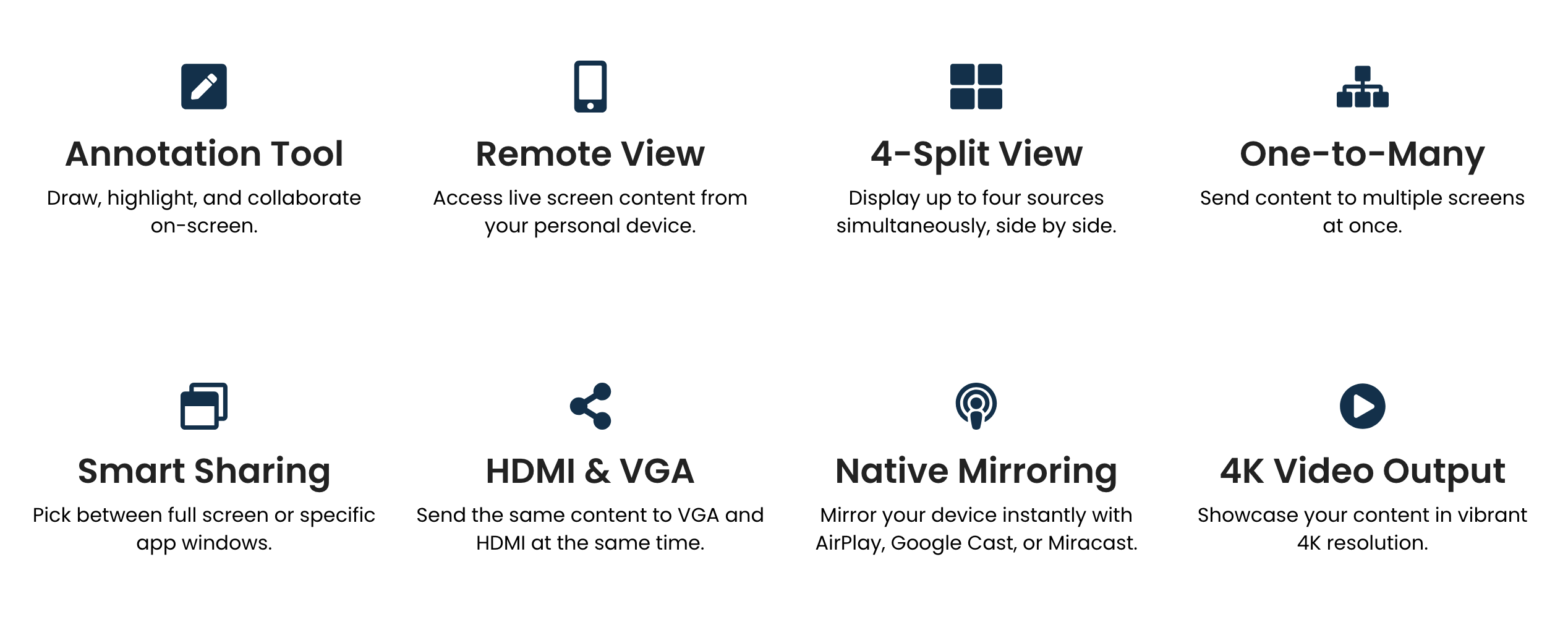 Transform any space into a wireless hub for BYOD and BYOM. With the ASTROS Station AS-201, teams can present, share, and conference effortlessly — no cables, no limits.