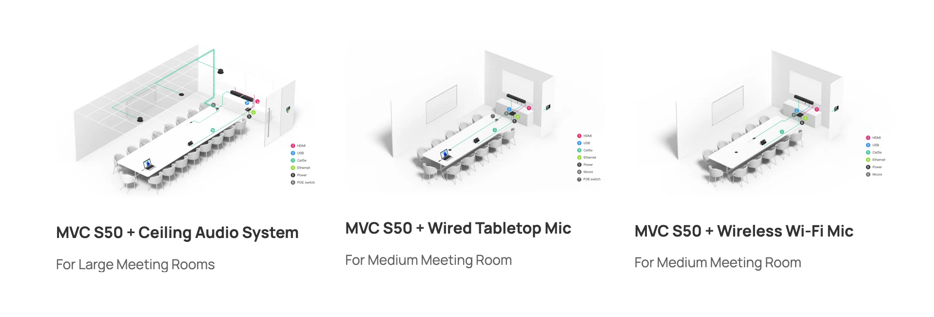 Designed for medium to large meeting rooms, MVC S50 is a bundle solution with all-in-one video bar A50 (USB mode),mini-PC MCore 4 and touch panel