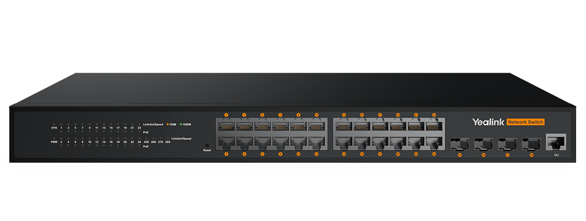 The Yealink RCH240 is a 24-port L2+ web-based managed AV switch designed for high-performance AV over IP