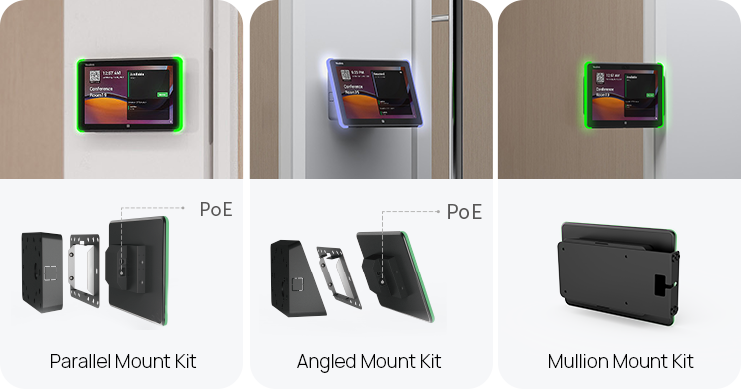 With the included brackets and tape, the RoomPanel E2 can be easily mounted at adjustable tilt angles on any surface, such as concrete, glass, wood, and more. Supporting both PoE and DC power, installation is streamlined and free from cable clutter.