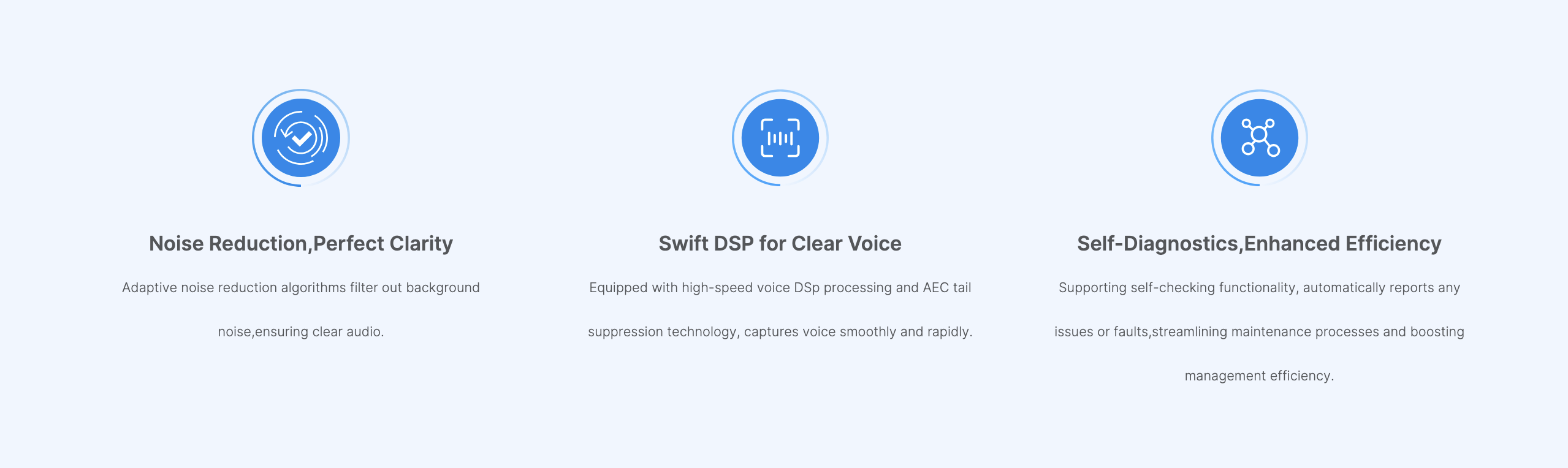 • PoE Support • Noise Reduction • AGC Audio Consistency • Integrated Shield Design • Audio Software Management