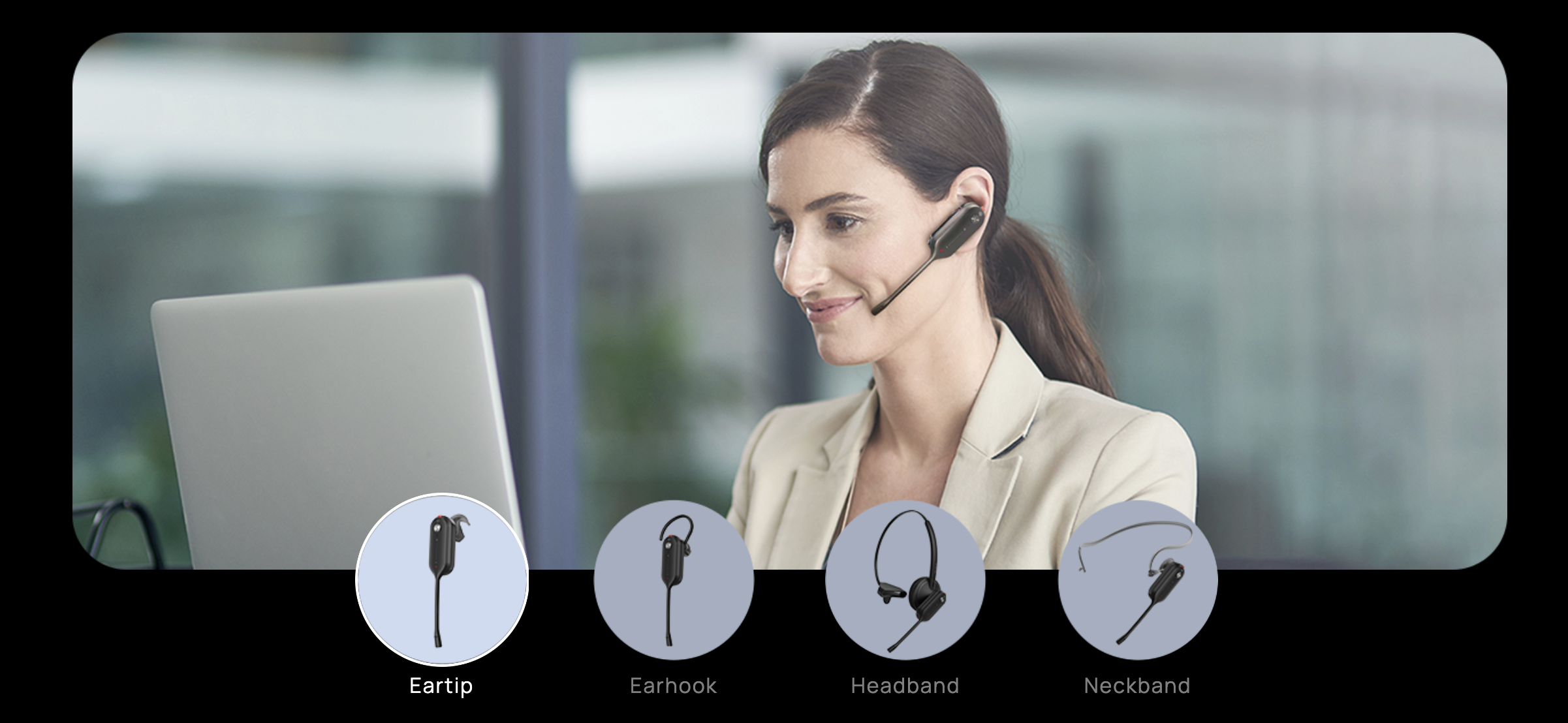 19g lightweight headset for all-day comfort. Choose from eartip, earhook, headband, or neckband styles* for a perfect fit.