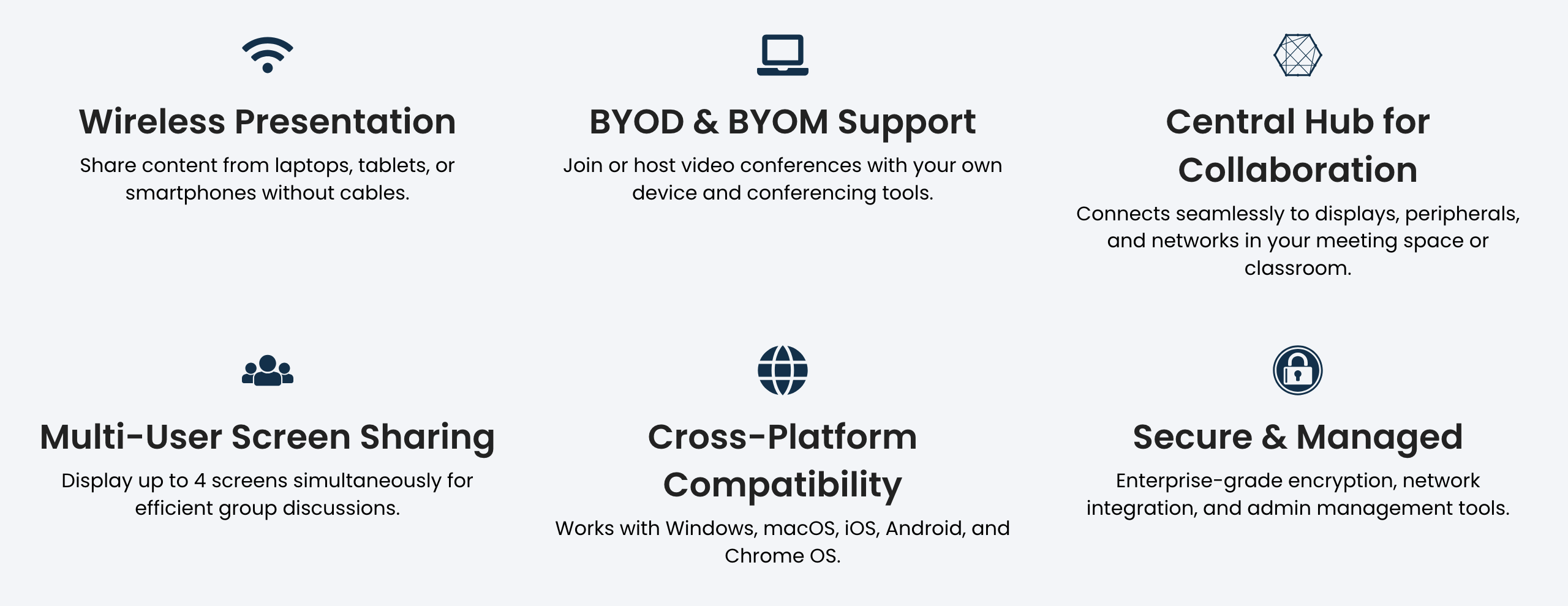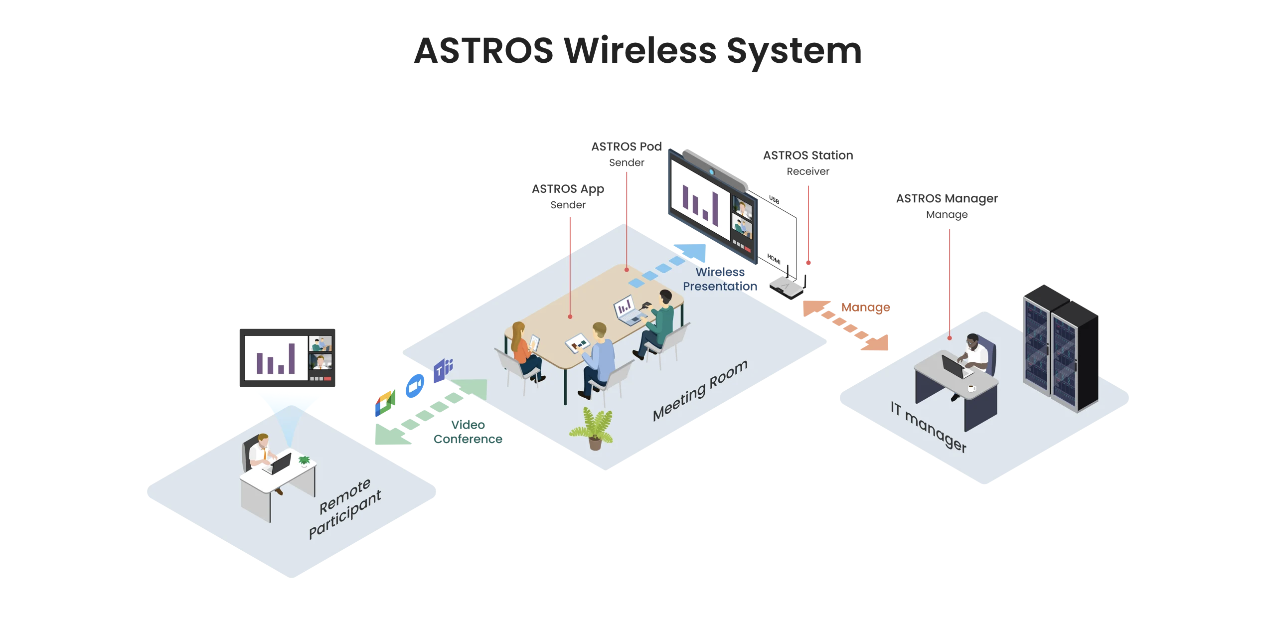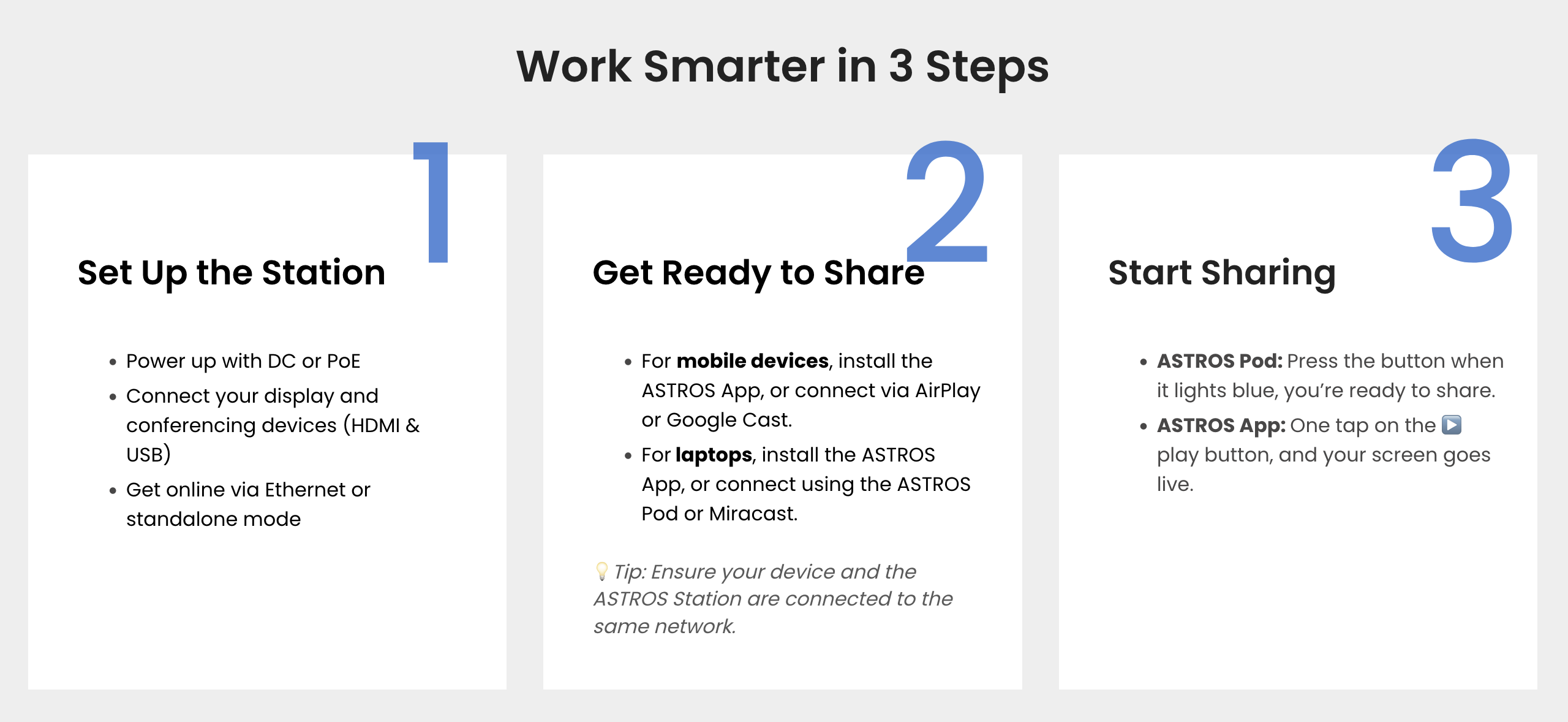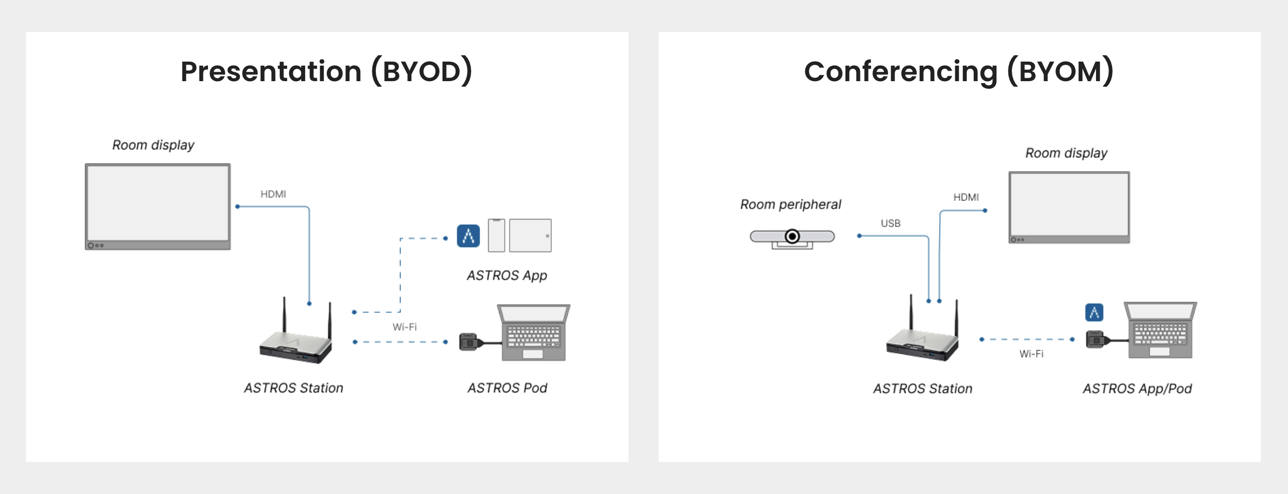 The ASTROS Station is the central hub that future-proofs your classrooms and meeting spaces. This powerful hardware device seamlessly connects to your room display and conferencing peripherals, enabling effortless wireless collaboration.