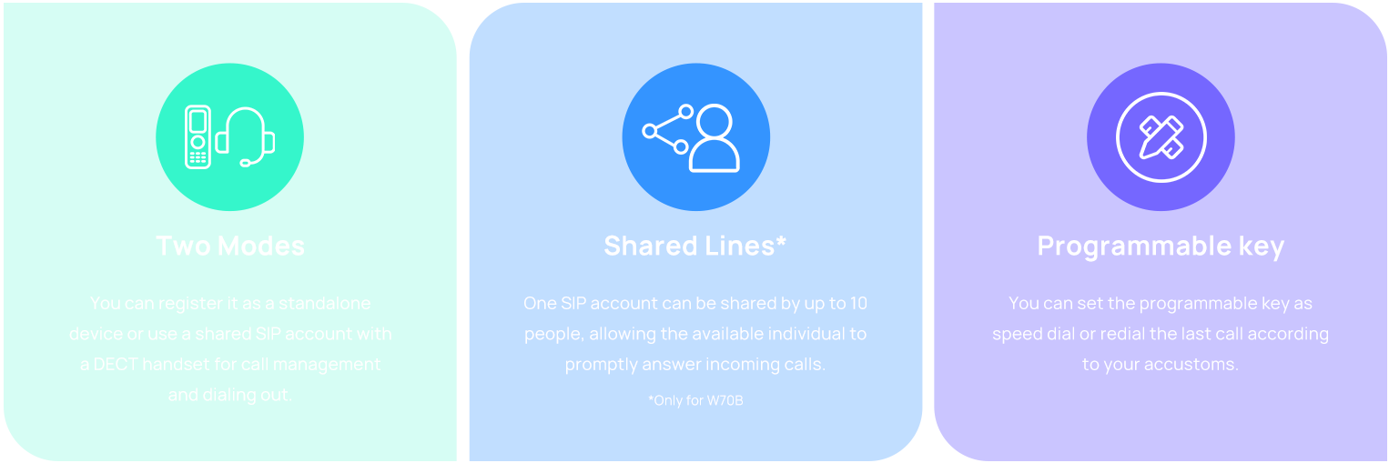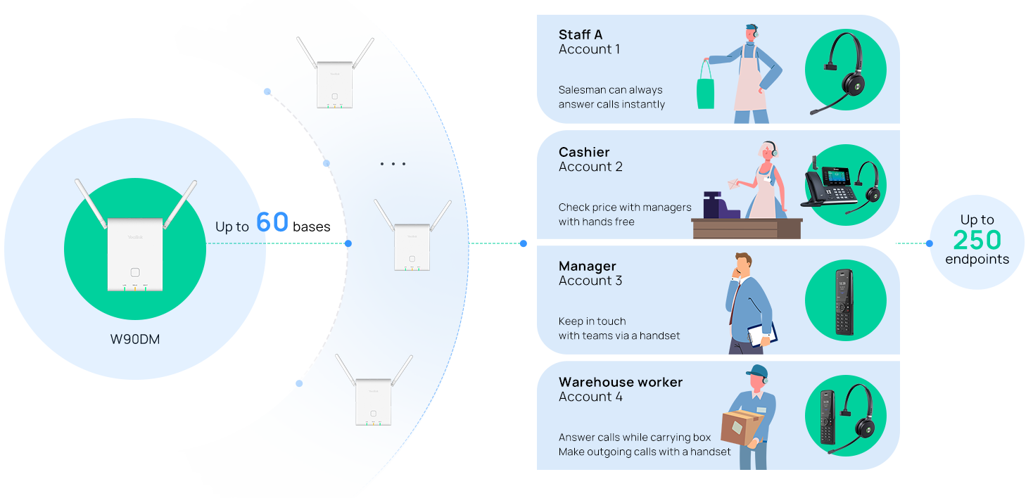 Ideal for places where multi-site coverage is needed, like multi-chain stores. Support up to 250 headsets. Push-to-talk and speed dial are coming soon with exceptional performance.