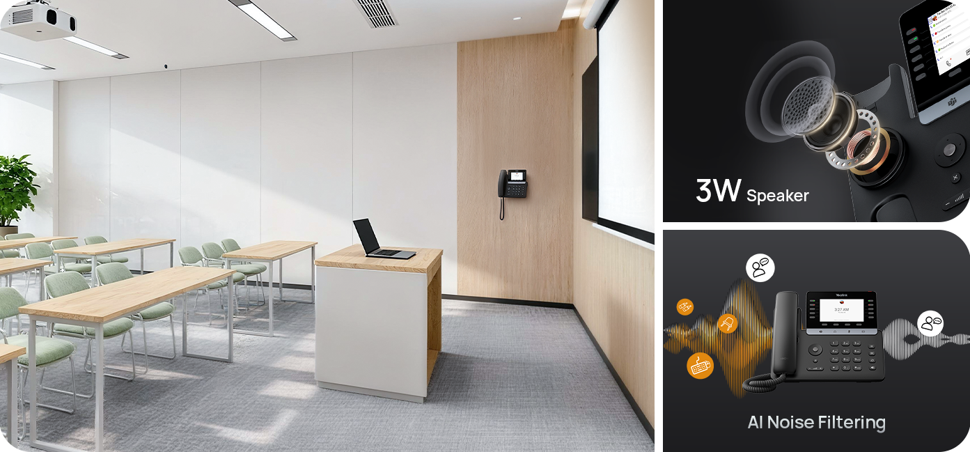 In educational common areas, the 3W speaker and AI noise filtering ensure