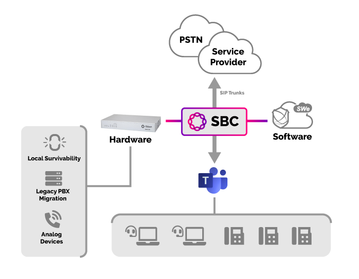 Enable Teams users to make and receive calls to/from the public telephone network if Microsoft 365 becomes unreachable. Microsoft’s Survivable Branch Appliance (SBA) capabilities are delivered as fully virtualized software in concert with the SBC SWe Edge. Microsoft’s SBA services provide organizations an additional level of resiliency and peace of mind that calling services can be preserved if the cloud becomes unreachable. Microsoft SBA services are tightly integrated into the SBC SWe Edge’s Easy Configuration Wizard, making set-up and administration as simple as point and click. Ribbon eliminates any SBA-related command line administration or stand-alone security certificate management. The virtual SBA software can also be deployed in concert with Ribbon's Core SBCs including SBC 5400, SBC 7000, SBC SWe and SBC CNe. Learn more by downloading the SBA datasheet .