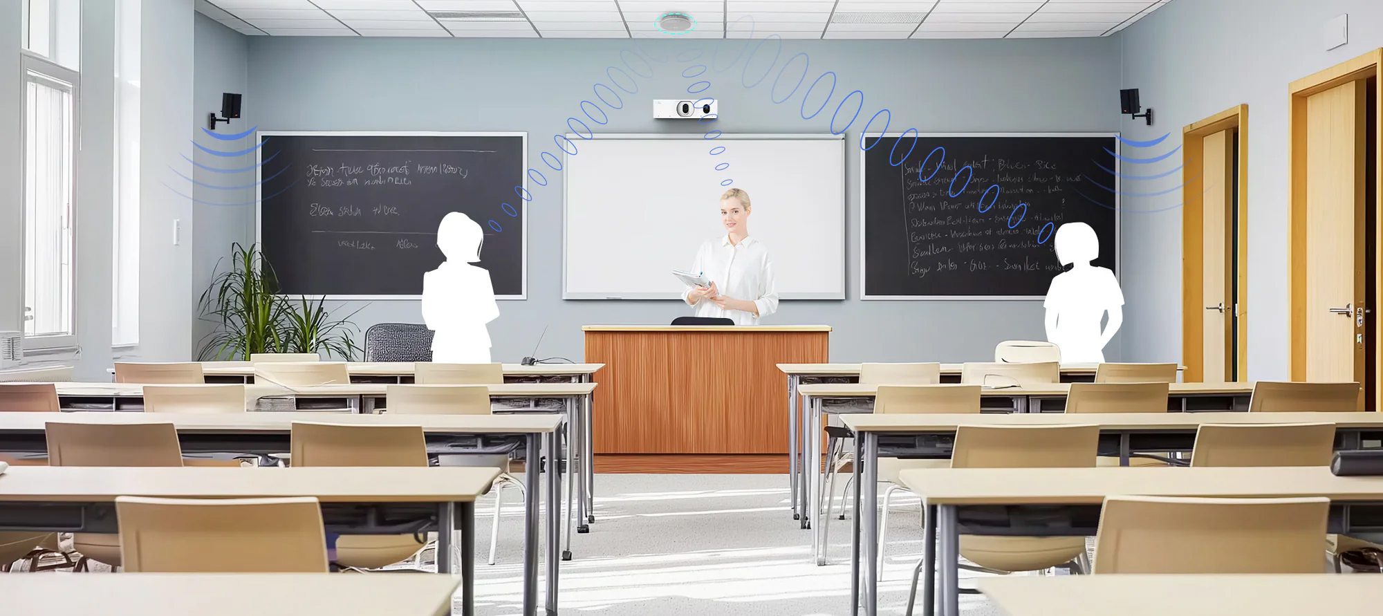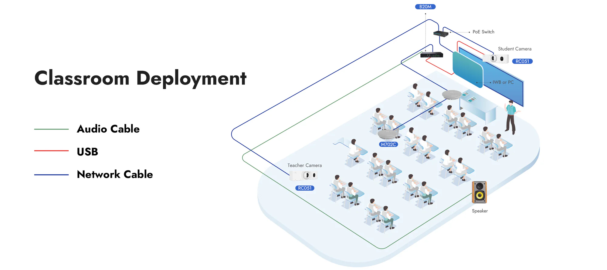 Integrated Al and microphone technology, when paired with the RM702C, ensure voice clarity is always at its best. The beamforming algorithms and 3A audio processing reduce classroom noise, keeping audio crisp and clear whether you're addressing the whole class or engaging one-on-one. Plus, it supports PoE for Ethernet cascade deployment, connecting up to 6 devices for flexible installations.