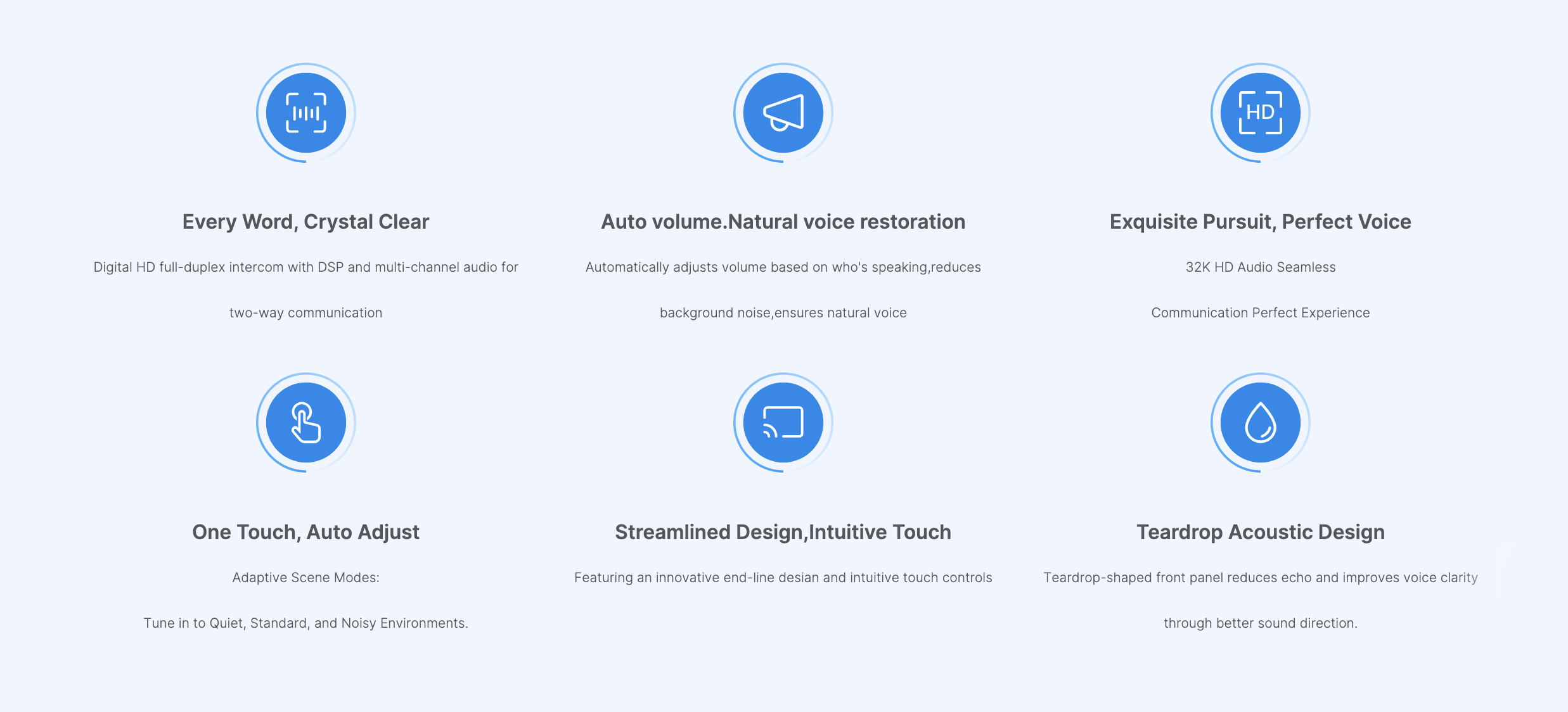 • Physical Button • DSP For Clear Intercom • Single-Cable Connection • Dual Recording Support • One-Touch Scene Modes • Noise Suppression, AGC
