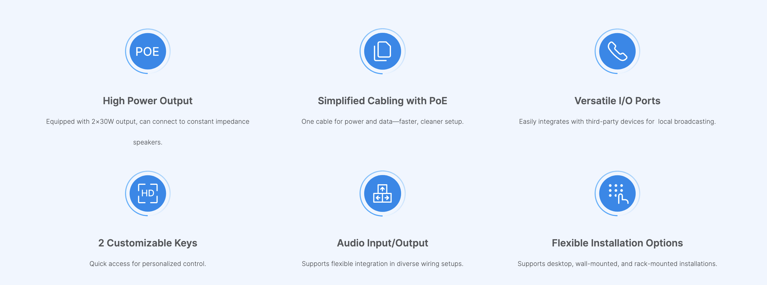 Powered by PoE or DC, it supports SIP/VMS calls, handles up to 20 multicast streams, and offers audio storage with scheduled playback. With a built-in 2×30W