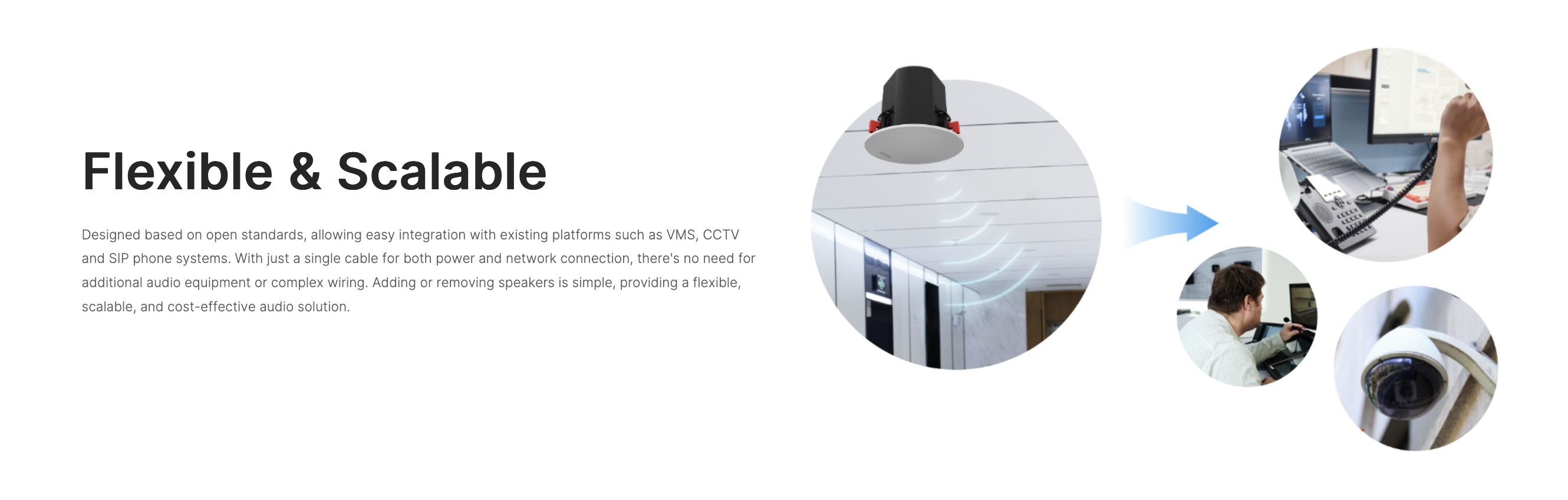 and supports SIP, ONVIF, and multicast audio for seamless integration with VoIP and video management systems.