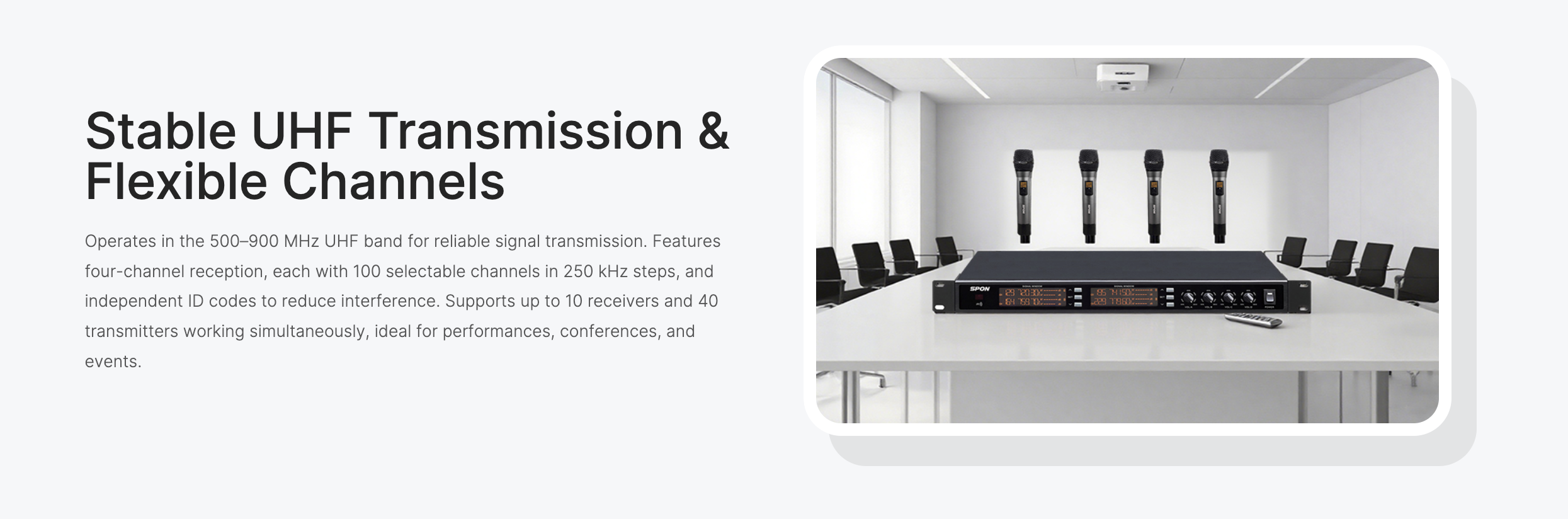 • Four-channel Signal Reception • Enhanced Stability Technology • Interchangeable, 400 Frequencies • UHF Frequency Band Transmission • Unique ID, Multi-Channel Capability