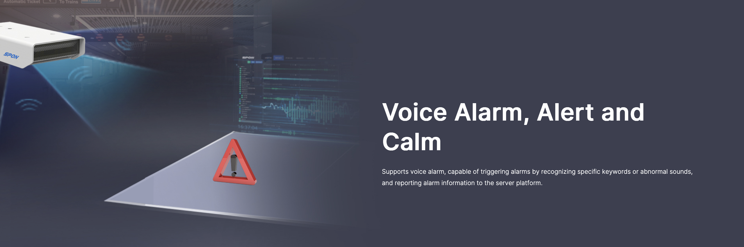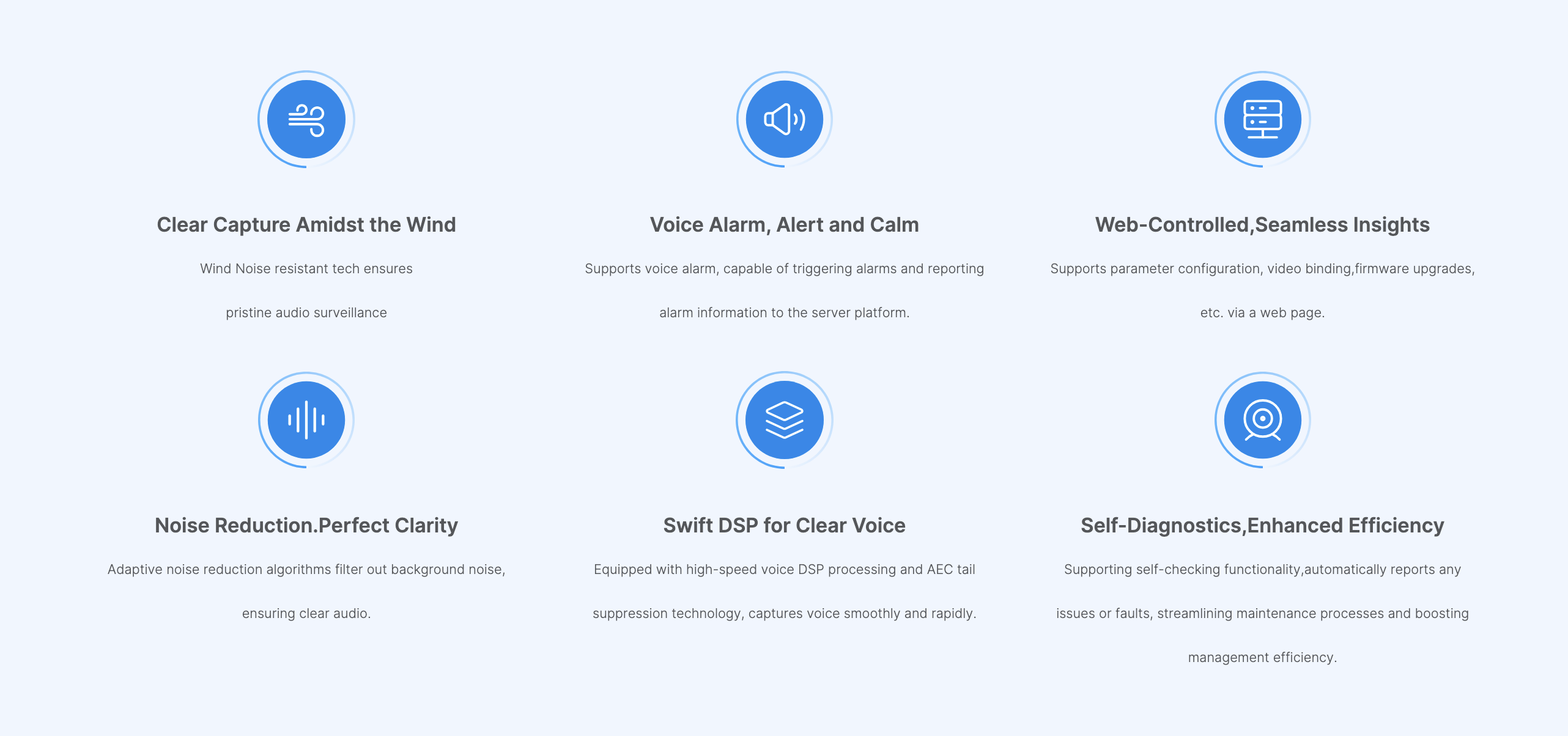 • IP67 Weather Proof • Dynamic Noise Reduction • Web Page Configurations • Integrations with IPC, NVR • Keyword and Sound Detection