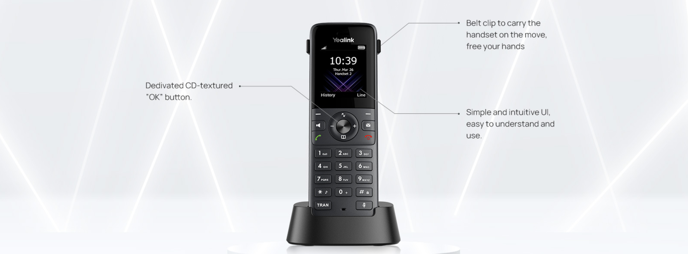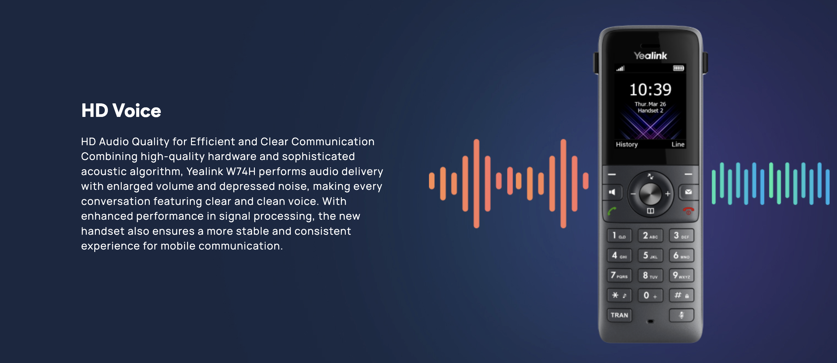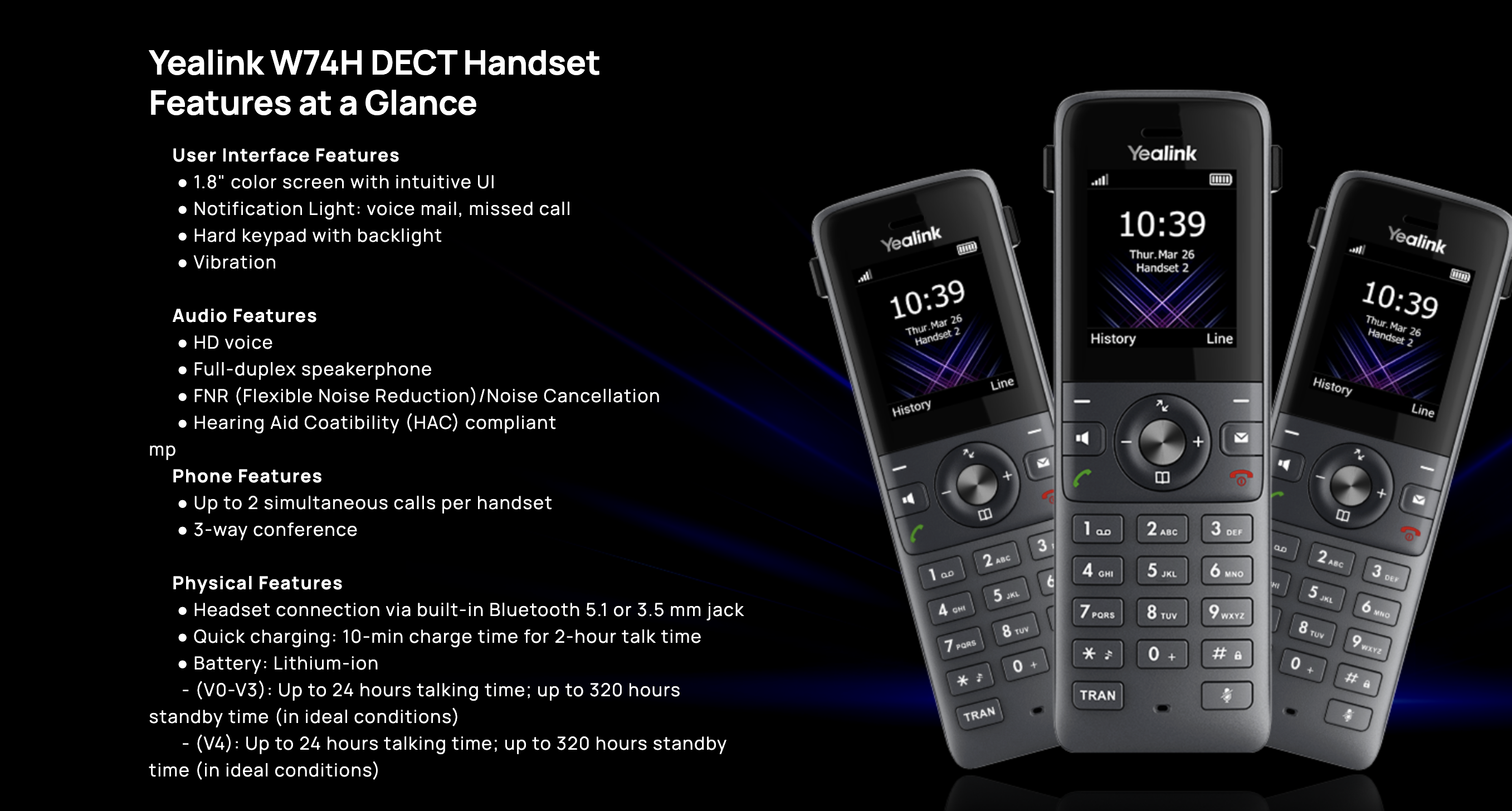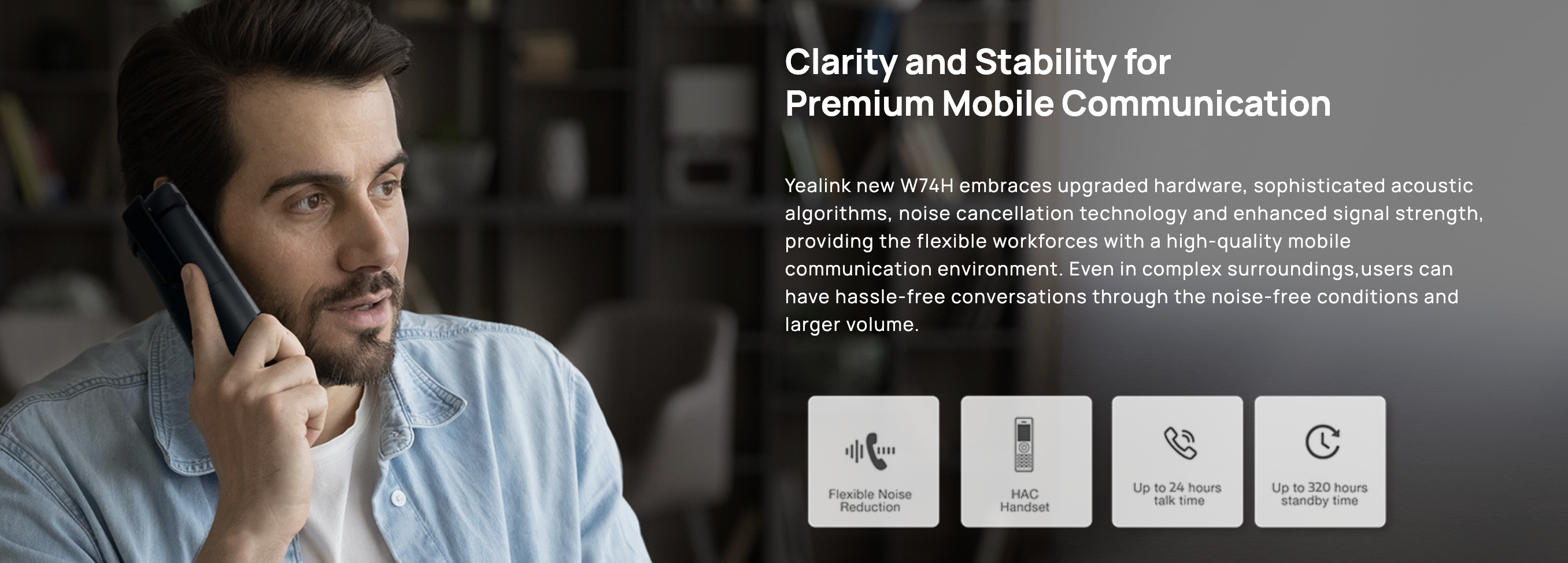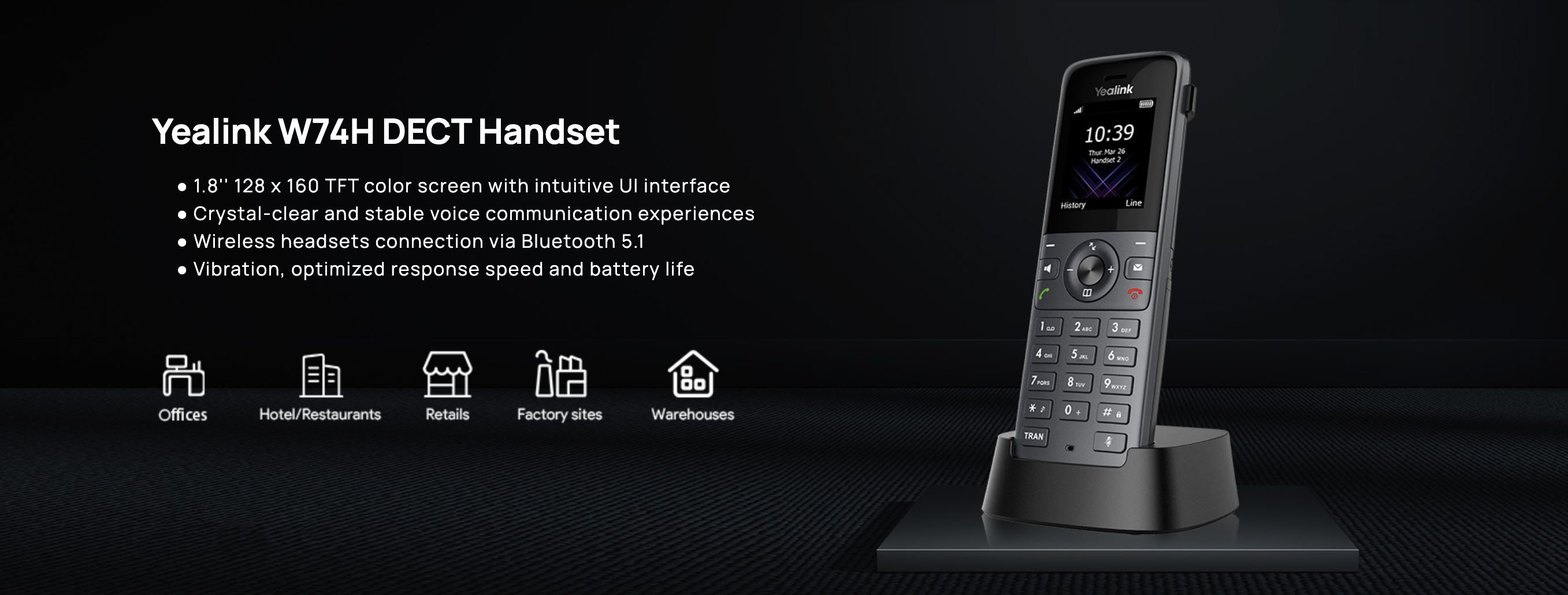 Yealink W74H is compatible with DECT bases of single cell (W70B) as well as multi-cell(W75B/W80B/W90B), offering scalable DECT solutions to meet diverse needs.providing superior mobile communication experience with seamless handover and an industry-leading roaming solution to meet diverse needs of scalable DECT solutions.