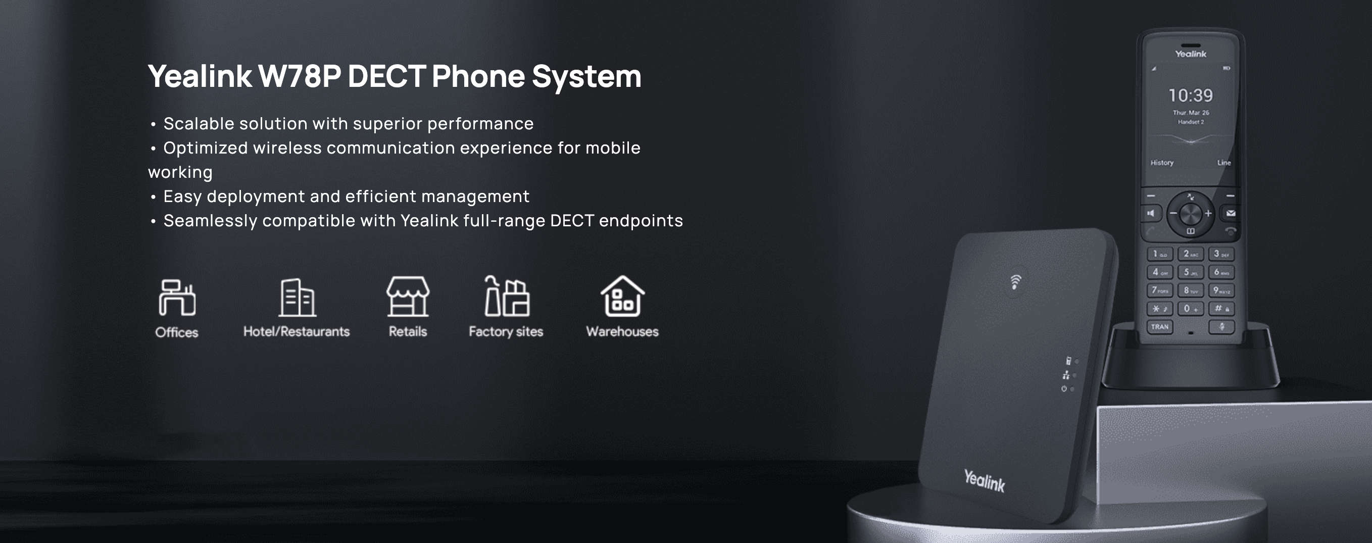 Yealink W78P DECT IP phone system is also compatible with Yealink whole series of DECT endpoints including handsets, conference phones and DD phones, offering additional choices for building up wireless communication network in various workspaces across small and medium size business.